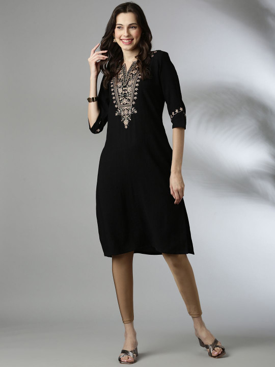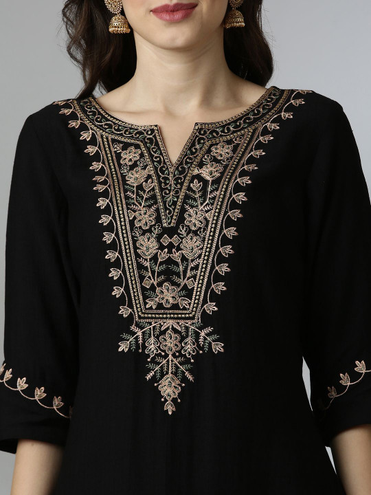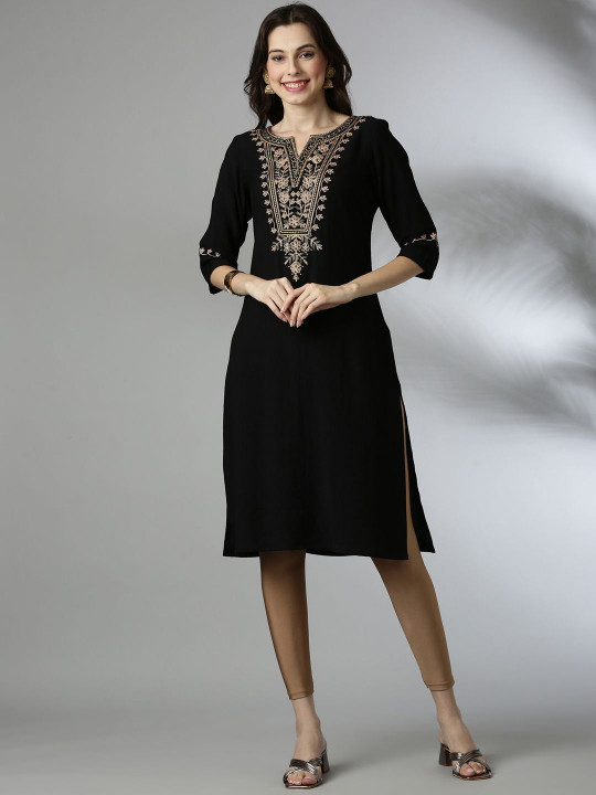 Floral Yoke Design Notch Neck Thread Work Straight Kurta